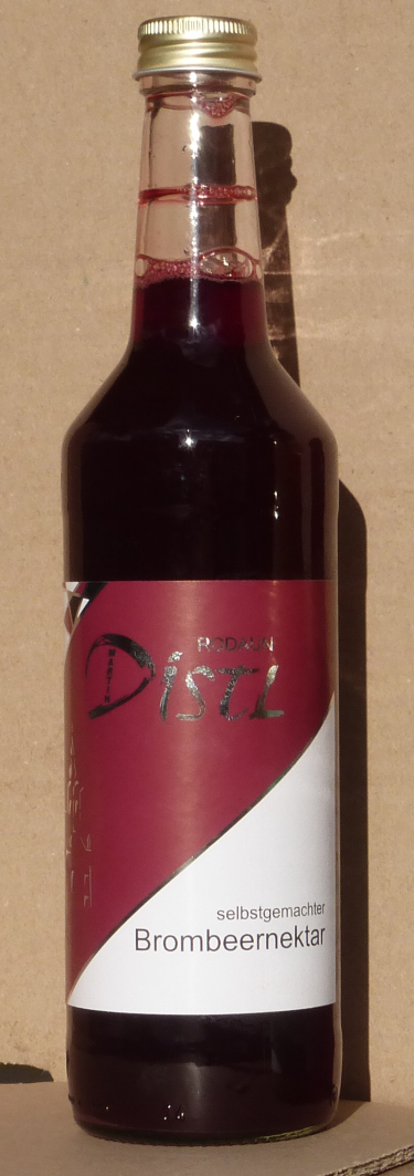 Selbstgemachter Brombeernektar mit Zuckerzusatz, etwa 1:8 mit Wasser verdünnbar. Füllmenge bedingt durch Heißfüllung.