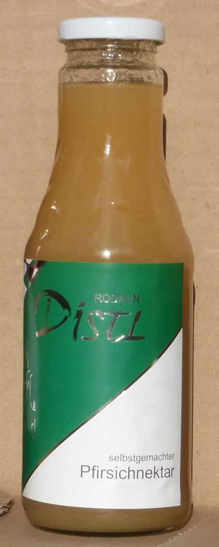 Frische Pfirsiche wurden mit Wasser verdünnt und mit dem gesamten Fruchtfleisch und etwas Zucker heiss in Flaschen gefüllt. Schmeckt ca. 1:3 mit Wasser verdünnt sehr erfrischend.