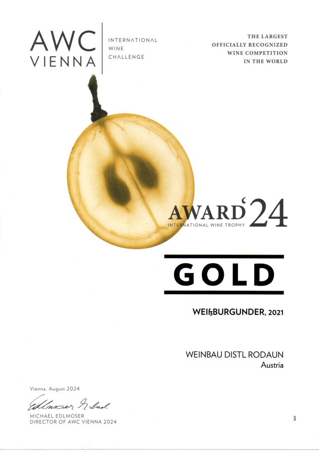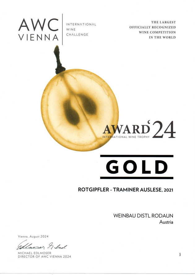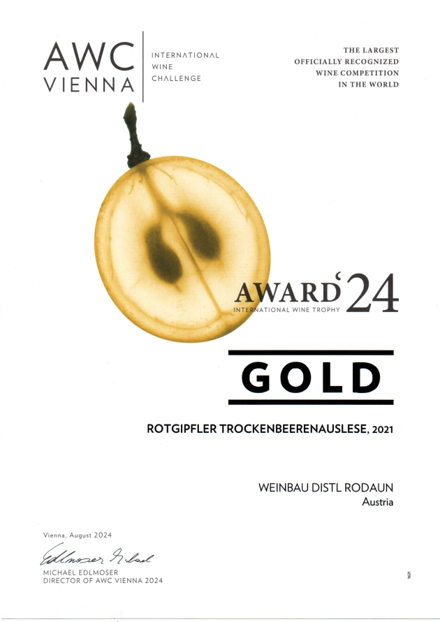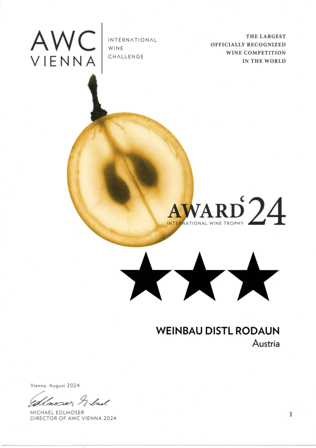 Da nicht jedes Jahr genügend "neue" Weine in die Flasche gefüllt werden, nahmen wir erst wieder bei der AWC 2024 teil. Unsere Mühen wurden mit 3 Gold und 4 Silbermedaillen belohnt, was uns diesmal in der Betriebsbewertung 3 Sterne eingebracht hat. Hervorragend bewertet wurde im internationalen Vergleich neben unseren süßen Klassikern unser halbtrockener, ausdrucksstarker Weißburgunder 2021, der deshalb noch länger im Verkauf zu finden ist. Der Chardonnay 2021, der Gelbe Muskateller 2022, der Riesling "Ried Sossen" 2022 und die Traminer Auslese 2019 erhielten die Medaille in Silber und runden damit den ausgezeichneten Erfolg ab.